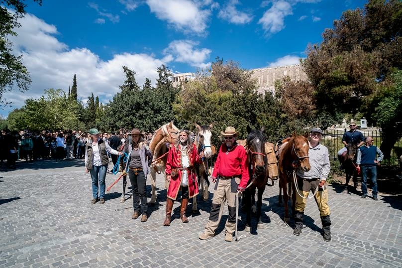 Die Wanderreiter_innen setzen auf der Route verschiedene Pferderassen ein: Criollo, Haflinger, Kabardiner und Karabagh. Sie werden von einem sechsjährigen Arravani-Hengst namens Hermes begleitet. Arravani ist ein griechisches „Gangpferd“, das für seine Eleganz und Ausdauer bekannt ist. Die Zahl der Arravanis ist heute leider rückgängig. Seine letzten verbliebenen Herden befinden sich in Griechenland und Deutschland. Hermes kommt aus dem arkadischen Berggebirge des Peloponnes und ist nach dem griechischen Gott des Handels und Diebstahls, der Musik und der Grenzüberquerungen benannt. Der mythologische Hermes ist auch der Gesandte und Bote der Götter und eine zentrale Figur im Denken von Michel Serres, dessen Schriften (zusammen mit denen von Giorgio Agamben, Étienne Balibar, John Berger, Jacques Derrida, Donna Haraway und Rainer Maria Rilke) bei der Entwicklung von The Athens-Kassel Ride mitgereist sind. Auf seiner Reise von Athen nach Kassel ist Hermes nicht nur im Transit zwischen Griechenland und Deutschland – einer Linie folgend, die die historischen und gegenwärtigen Spannungen von Europa nachzeichnet – sondern auch zwischen Mythos und Materialität, Wirtschaft und Politik, Philosophie und Handeln, Menschen und Tieren.