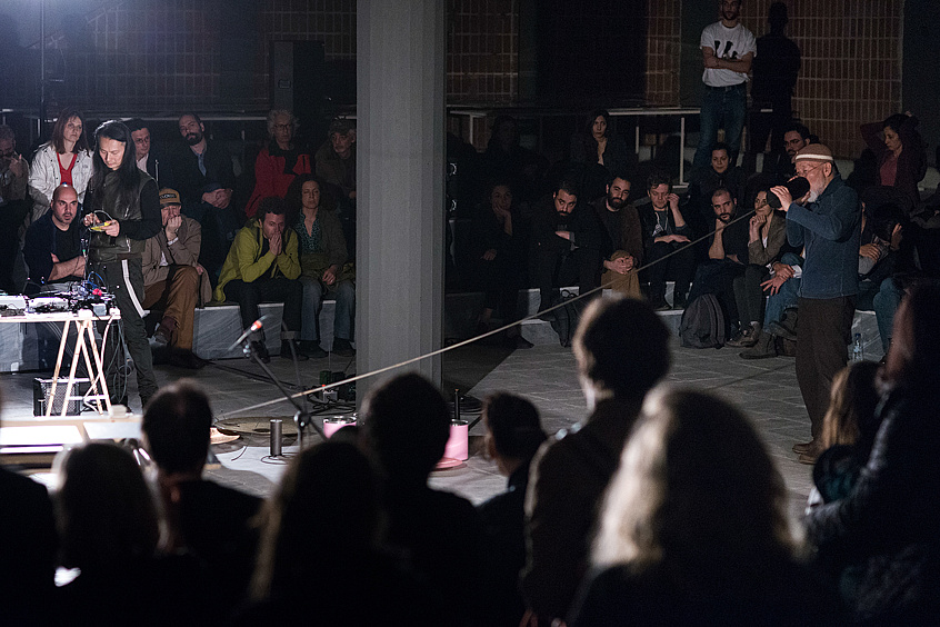 Listening Space is a program of events that attempts to explore and understand sound outside established hierarchies of music production and performance. In the project’s diverse concerts, lectures, and performances, forms of sonic expression take cues from architectural modifications, visual barriers, speaker configurations, natural-sound environments, listening instructions, and spatial choreographies. In this way, the program seeks sonic conditions that go beyond sound’s aural signification, instead illuminating how its physical, social, and political dimensions can be performed and heard. Listening Space is curated by Paolo Thorsen-Nagel, documenta 14’s Sound and Music Advisor. The Athens club and studio complex Romantso serves as the program’s home base, with the project extending to other locations including Megaron, The Athens Concert Hall, the Athens Conservatoire (Odeion), and the Church of Agios Dimitrios Loumbardiaris. All Listening Space events are free of charge.