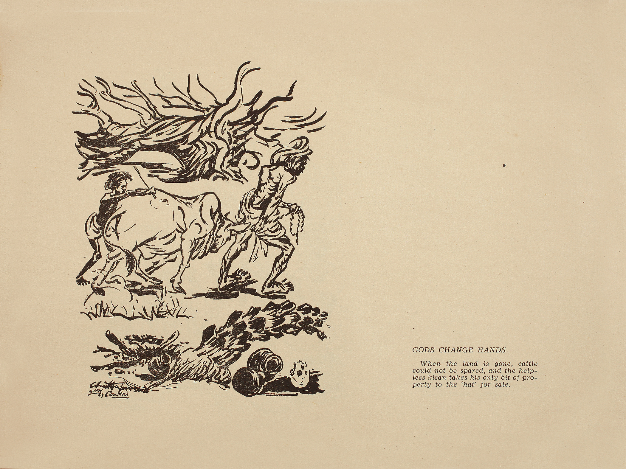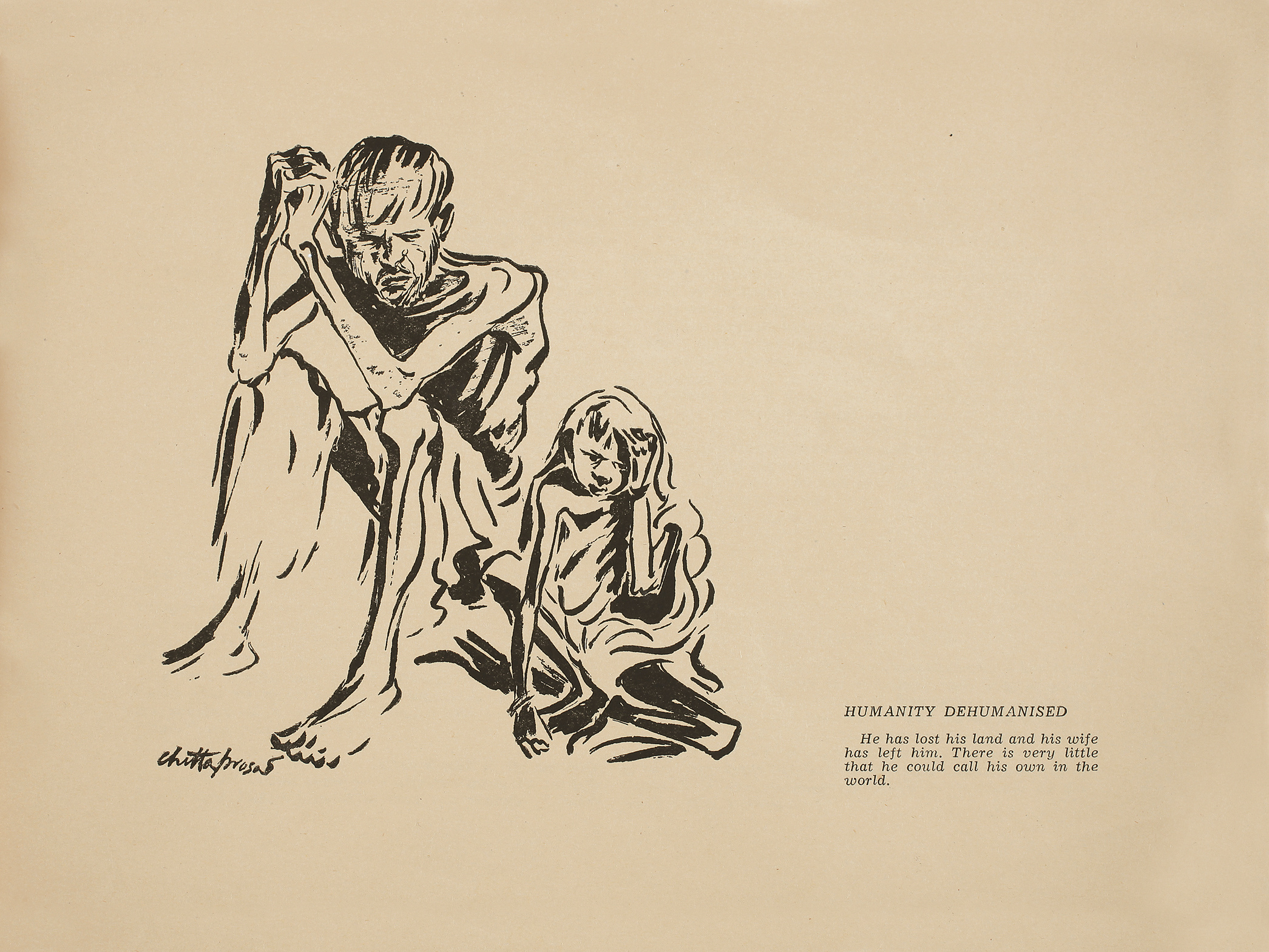 In seiner einführenden Zeichnung Humanity Dehumanised porträtiert Chittaprosad einen jungen Vater mit Kind, der teilnahmslos und unterernährt am Rand seiner Seite sitzen. Eine Bildunterschrift fordert den Leser auf, an das Leben derer zu denken, die nahe Familienangehörige und ihr angestammtes Land verloren haben. Hungry Bengal verströmt ein Gefühl von Verlorenheit, da der Künstler-Aktivist die persönlichen Geschichten von Menschen am Rande ihrer Existenz untersucht. Auf seiner dokumentarischen Reise entdeckte Chittaprosad eine Gestalt, die sich in einem Kornfeld versteckte und die er als „eine kleine schwarze Puppe aus Knochen“ beschreibt – dieses Kind namens Ananta hatte seine Familie an die Cholera verloren und seine Bewältigungsstrategien aufgegeben. Der Künstler rettete ihn und setzte sich dafür ein, dass der Junge wieder gesund wurde. Chittaprosad entwarf sogar ein Poster für den berühmten Film Do Bigha Zamin (Zwei Hektar Land, 1953) des Regisseurs Bimal Roy, der das Schicksal eines Bauern und seinen Kampf um ein Stück Land zu Zeiten der Hungersnot schildert. Roys im Stil des italienischen Neorealismus gedrehter Film dokumentiert das verzweifelte Leben eines Bauern, der weniger als einen Morgen angestammten Landes vor dem Zugriff eines örtlichen Geldverleihers verteidigt; Letzterer möchtet dieses Land jedoch für den Bau einer Fabrik verkaufen.