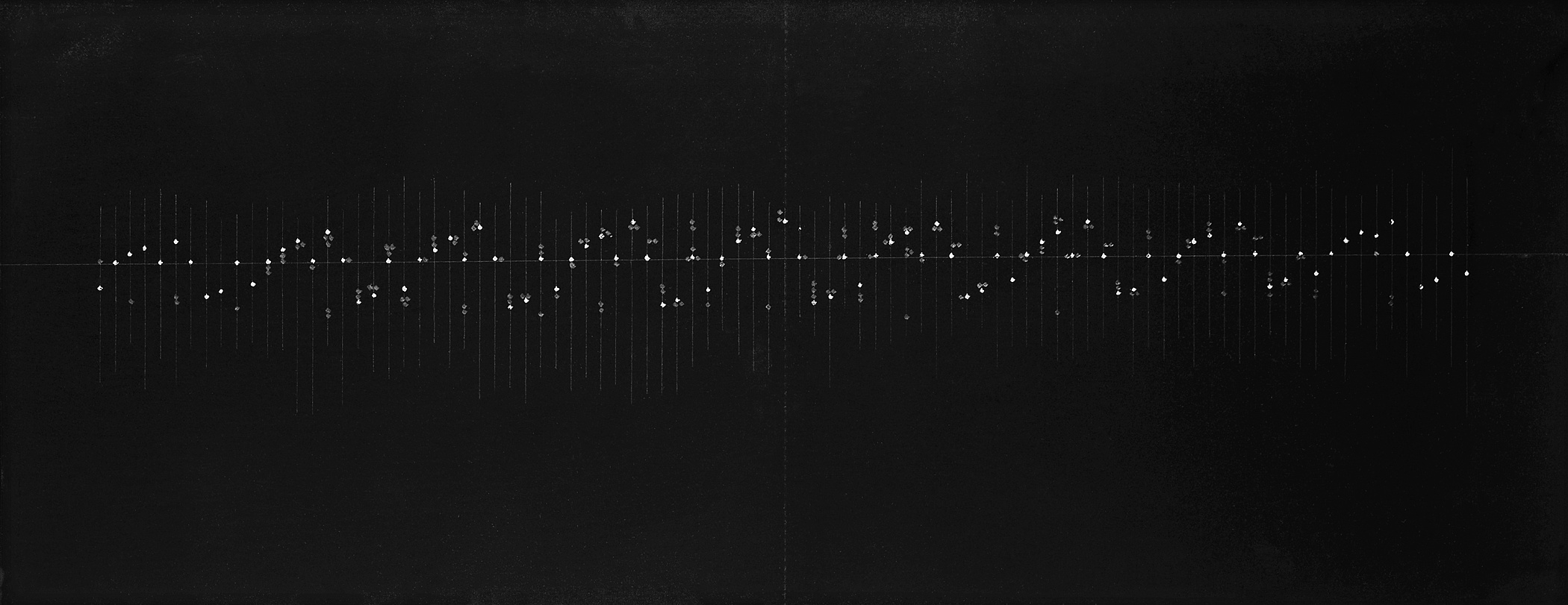 Notationssysteme finden auch in Teile der Landschaft Eingang. Lalas Arbeiten berufen sich auf den menschlichen Körper und die sich verschiebenden Grenzen der Erde; sie verquicken Ausdehnung und Beschränkung, Stillstand und Bewegung. Nightscape II (2011) ist eine optische Herausforderung, die sich zum Nachthimmel – einem Terrain, auf dem sie ungehindert umherstreifen kann – als Verbündeten und zur Dunkelheit als einem zu entziffernden Lexikon bekennt. Beim Anblick einer dreidimensionalen Landkarte von dunkler Materie im Universum empfand ich in den grafischen Linien, die ein Flimmern andeuten und dann fast nichts werden, eine Verwandtschaft mit der „Nightscapes“-Serie.