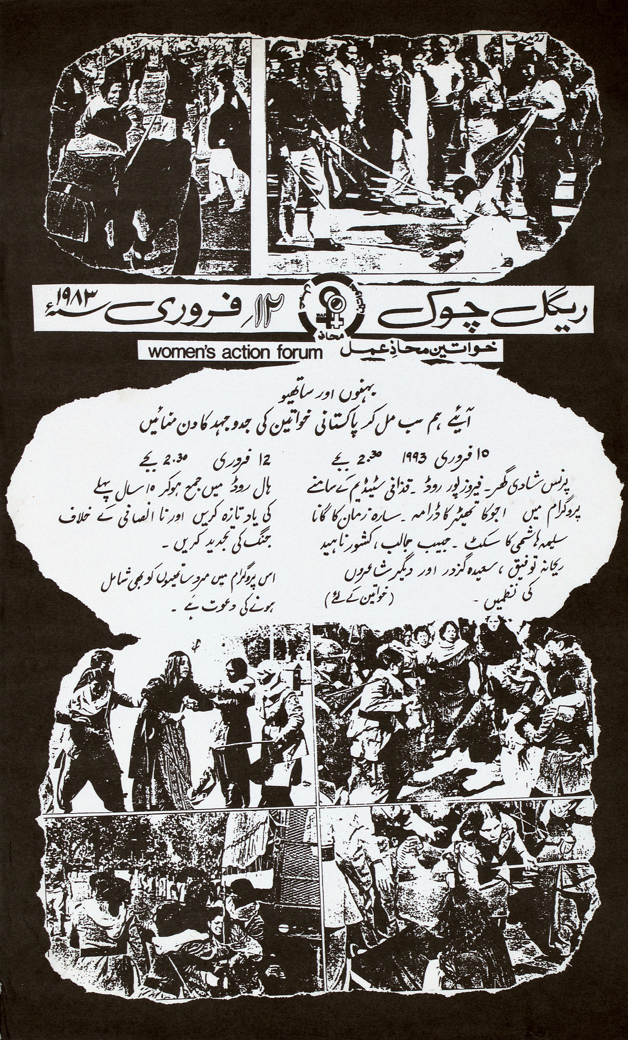 Lala Rukh, Flyer für das Women’s Action Forum, Ankündigung einer Veranstaltung in Jalsa am 10. Februar und einer Demonstration am 12. Februar 1993, Offsetdruck