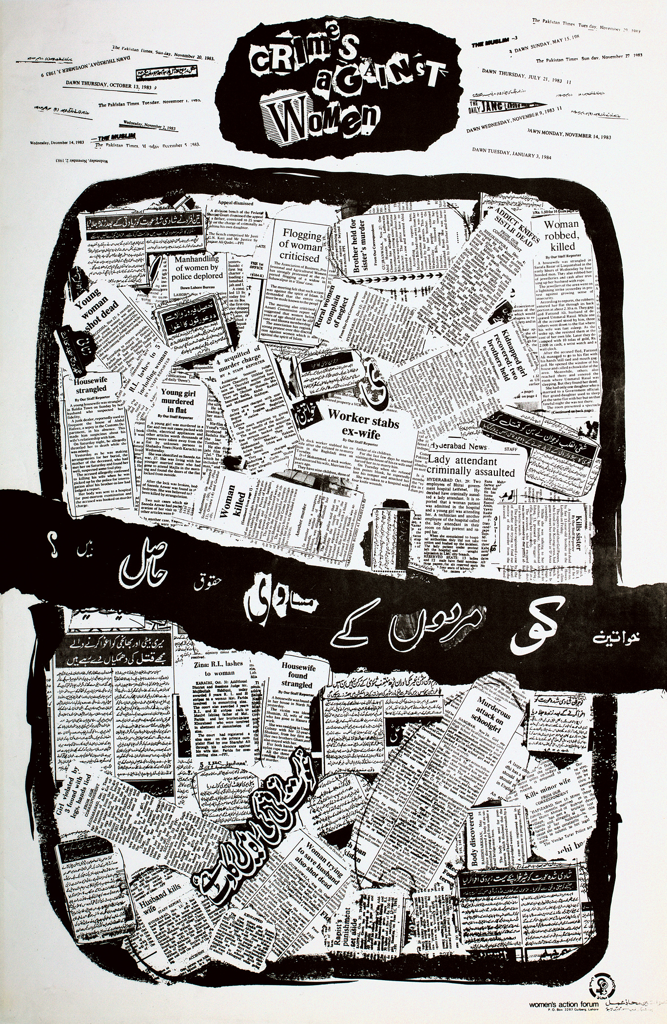 Lala Rukh, Crimes against Women (1985), Poster für die Kampagne des Women’s Action Forum, Offsetdruck, 67,3 × 44,5 cm