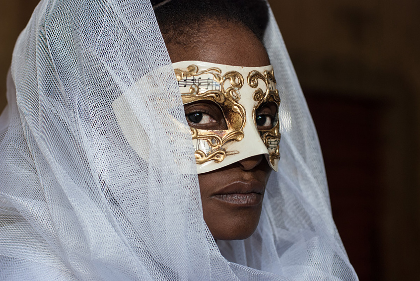 Traces, or fragments, of suspended, restrained gestures—prisoners of a body that yearns to express the sexes and the countenances of the “elsewhere” that she, the performer, Kettly Noël, invokes. The tension, the surprise, the horror, and the joy that is read on her face creates an interior world into which we are sucked. It is impossible for us to extricate ourselves: we are caught—prisoners, trapped, taken to task, ensnared in the game. Each movement conveys ambiguity. A caress can become a blow, a step can become a tumble or a fall, desire can turn into surrender. Her clothing could be a dress, a shroud, a straightjacket… Blurring the boundaries between executioner and victim, child and adult, man and woman, the performer rejects separation. Pushed to the limit by these different states of domination, of violence, she seeks to free this force that could contain everything.