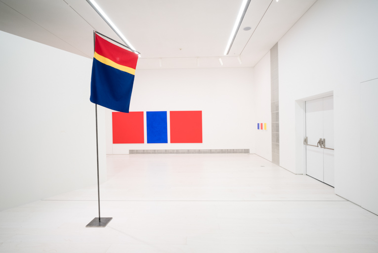Synnøve Persen, works from the series "Sámi Flag Project,” 1977–, installation view, EMST—National Museum of Contemporary Art, Athens, documenta 14, © VG Bild-Kunst, Bonn 2017, photo: Mathias Völzke
