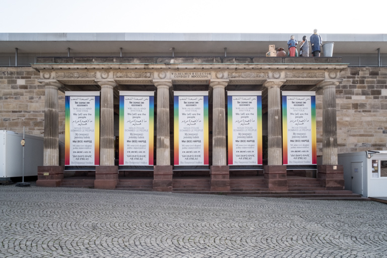 Hans Haacke, Wir (alle) sind das Volk—We (all) are the people, 2003/2017, five banners, installation view, Friedrichsplatz, Kassel, documenta 14, © VG Bild-Kunst, Bonn, photo: Mathias Völzke