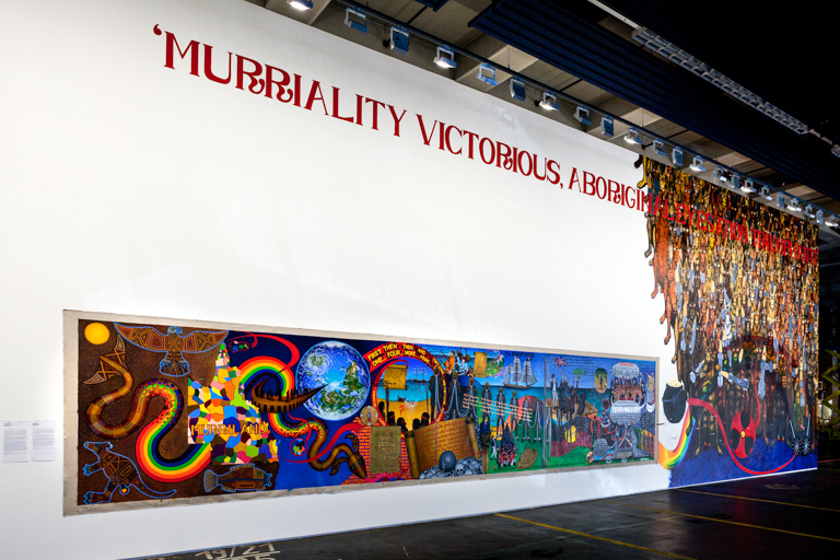Gordon Hookey, MURRILAND!, 2017, oil on linen and mural , Neue Neue Galerie (Neue Hauptpost), Kassel, documenta 14, © VG Bild-Kunst, Bonn 2017, photo: Michael Nast