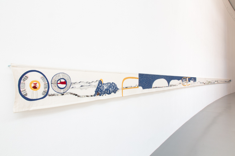 Britta Marakatt-Labba, Historja, 2003–07, embroidery, print, appliqué, and wool on linen , documenta Halle, Kassel, documenta 14, © VG Bild-Kunst, Bonn 2017, photo: Roman März