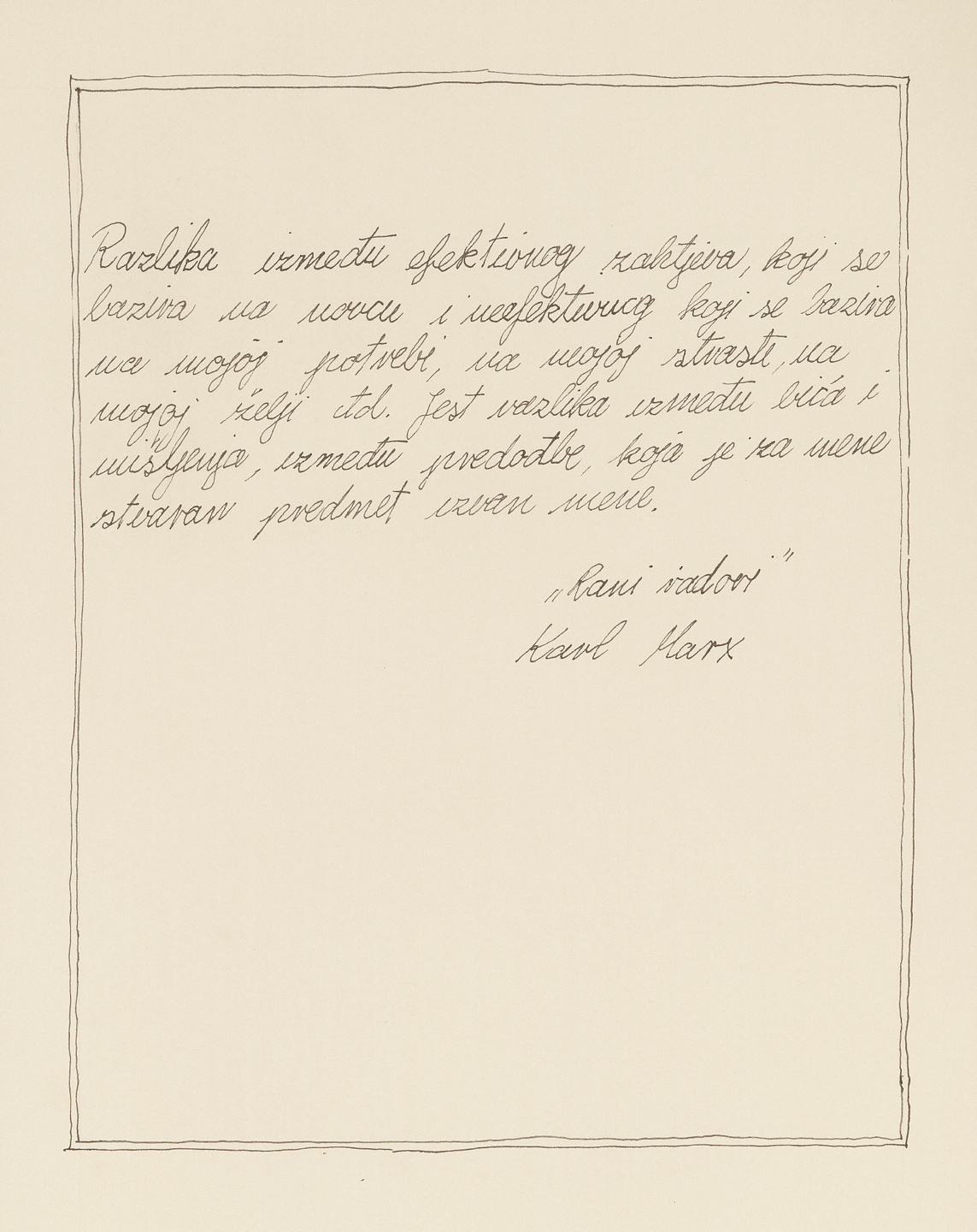 Landing page and following images: Sven Stilinović, Marx and Stilinović (1980), three black-and-white photographs, sheet of paper with text, corduroy cover