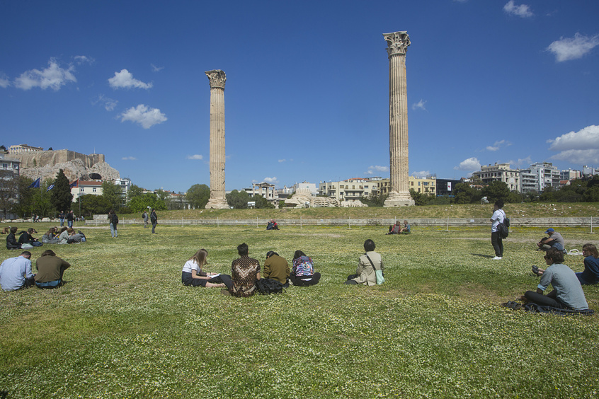 One of the largest temples of the ancient world, the Temple of Olympian Zeus was first planned in 515 BC by Peisistratus the Young. Construction, however, stalled for more than six hundred years and only resumed in the second century AD under the command of Roman emperor Hadrian. During the Byzantine era, the marble of the temple was used for building the city’s nearby houses and churches. Of the temple’s 104 massive Corinthian style columns, only fifteen are still standing today, while one lies fallen; hit by a storm in 1852, it was left grounded in a line of symmetrical marble rings. Prinz Gholam perform corporeal constellations on this site, which they have internalized from paintings, sculptures, and historical photographs sourced from Delacroix, the pictorial language of Nelly’s, and Wilhelm von Plüschow’s ambivalent arcadian codes, to name just a few.
