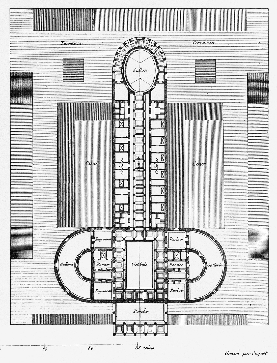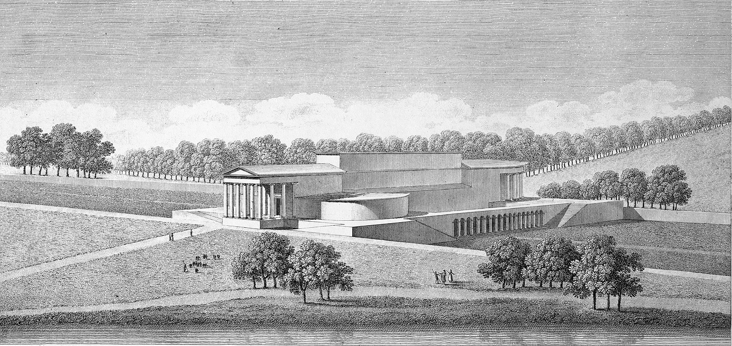 Claude-Nicolas Ledoux, όψη του «Οικήματος» της ιδεατής πόλης Chaux στη Γαλλία, χαρακτικό του Coquet