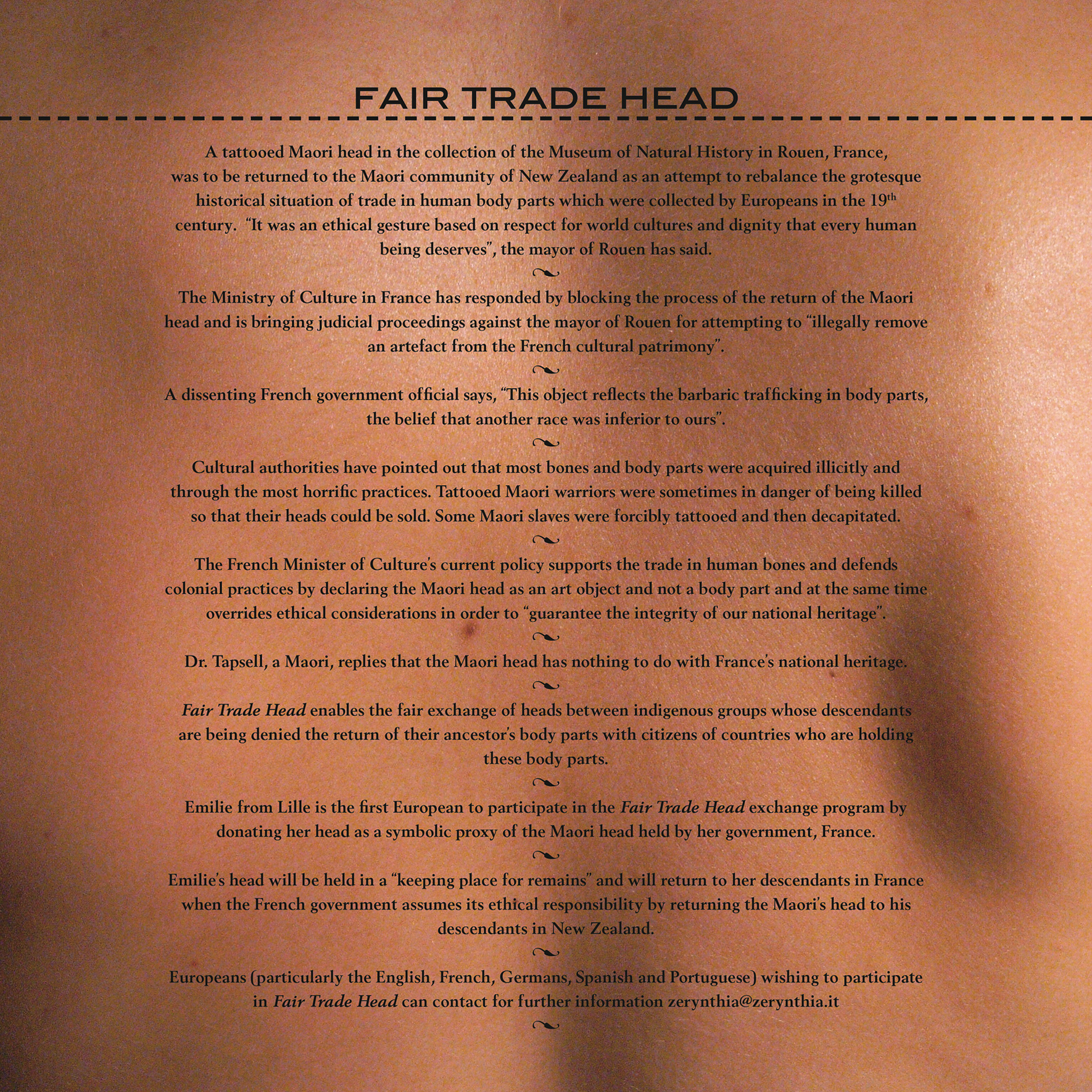 CH Τα μουσεία περιγράφονται από τον ανθρωπολόγο Ira Jacknis ως θεσμοί αντανάκλασης που προβάλλουν τον πολιτισμό κάποιου πάλι στον ίδιο. Maria Thereza, σκέφτηκα ότι χρησιμοποίησες αυτή την αρχή με ιδιαίτερη επιτυχία στο πλαίσιο του Fair Trade Head, όταν παρουσιάστηκε ως τμήμα του Μουσείου Ευρωπαϊκής Κανονικότητας, ενός έργου που δημιούργησες σε συνεργασία με τον Jimmie Durham (με τη συμμετοχή του Michael Taussig) για τη Manifesta 7, το 2008. Στο μουσείο η «ευρωπαϊκότητα» αντανακλάται στον εαυτό της μέσω της έκθεσης αντικειμένων, ανθρωπολογικών μελετών και φιλοσοφικών κειμένων για τη μορφή της ευρωπαϊκής κανονικότητας μετά το 1945, μέσω της μελέτης των ηθών και των εθίμων της και των δημόσιων τελετών της. Θεωρώ ότι το έργο εξέθεσε πολύ επιτυχημένα κάποιες αντιφάσεις στο εσωτερικό της αυτοαφήγησης της Δύσης.