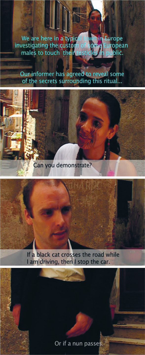 Το Male Display προβλήθηκε στη Φινλανδία και μια Ιταλίδα επιμελήτρια αισθάνθηκε βαθιά προσβεβλημένη. Είπα, λοιπόν: «Είναι ένα βίντεο για ένα ευρωπαϊκό τελετουργικό. Το αντιμετωπίζουμε ως κάτι πολύ παράξενο, που δεν είναι μέρος της πολιτιστικής μας αποσκευής. Ακριβώς όπως εσείς κοιτάτε τα δικά μας, έτσι κι εμείς κοιτάζουμε τα δικά σας». Η επιμελήτρια είπε: «Αυτό όμως δεν είναι τελετουργία». Δεν μπορούσε να αντέξει το γεγονός ότι η λέξη τελετουργία [ritual] ήταν δυνατόν να συνδεθεί με έναν ευρωπαϊκό πληθυσμό. Της είπα: «Ο ορισμός του τελετουργικού είναι να εκτελείς μια πράξη κατ’ επανάληψη. Το βλέπεις συνέχεια αυτό στους δρόμους της Ιταλίας, στους δρόμους της Πορτογαλίας, στους δρόμους της Ισπανίας – κάθε μέρα, κάθε πρωί. Πώς αλλιώς μπορούμε να το ονομάσουμε;».
