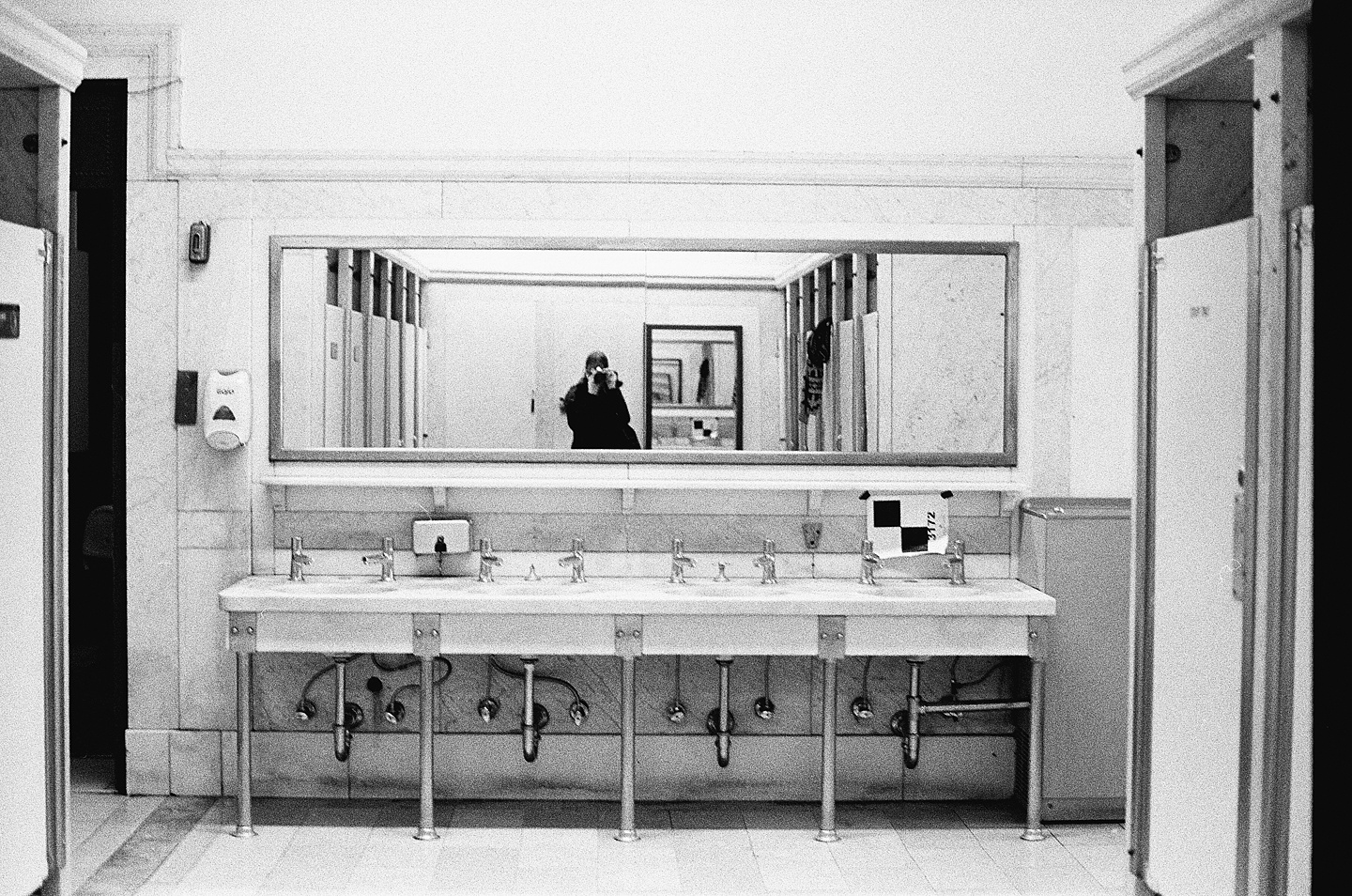 Αφού τράβηξα στη Συλλογή Berg τις είκοσι φωτογραφίες που μου είχαν επιτρέψει να βγάλω, απέμειναν δεκαέξι στάσεις και αποφάσισα να τελειώσω το φιλμ στους δημόσιους χώρους της βιβλιοθήκης. Περιπλανήθηκα στις αίθουσες φωτογραφίζοντας παλαιούς τηλεφωνικούς θαλάμους, που θυμήθηκα ότι τους χρησιμοποιούσα κι εγώ δεκαετίες πριν, το λουτρό των γυναικών, που είχε παραμείνει ανέπαφο από τότε που φίλμαρα εκεί με Super 8 το 1990, το ξεφτισμένο χρώμα στο ταβάνι, το πλούσια φωτισμένο Beaux-Arts αίθριο με τους πολυελαίους και τους περίτεχνους τοίχους του. Φωτογράφισα ακόμα ένα κυρτό κάτοπτρο, το φως του ηλίου πάνω στα μαρμάρινα σκαλοπάτια και, τέλος, έναν νεαρό άνδρα να βηματίζει πάνω κάτω μπροστά από μια άδεια γυάλινη βιτρίνα μιλώντας στο κινητό του, με τη φιγούρα του να φωτίζεται από ένα από τα μεγάλα παράθυρα της βιβλιοθήκης.