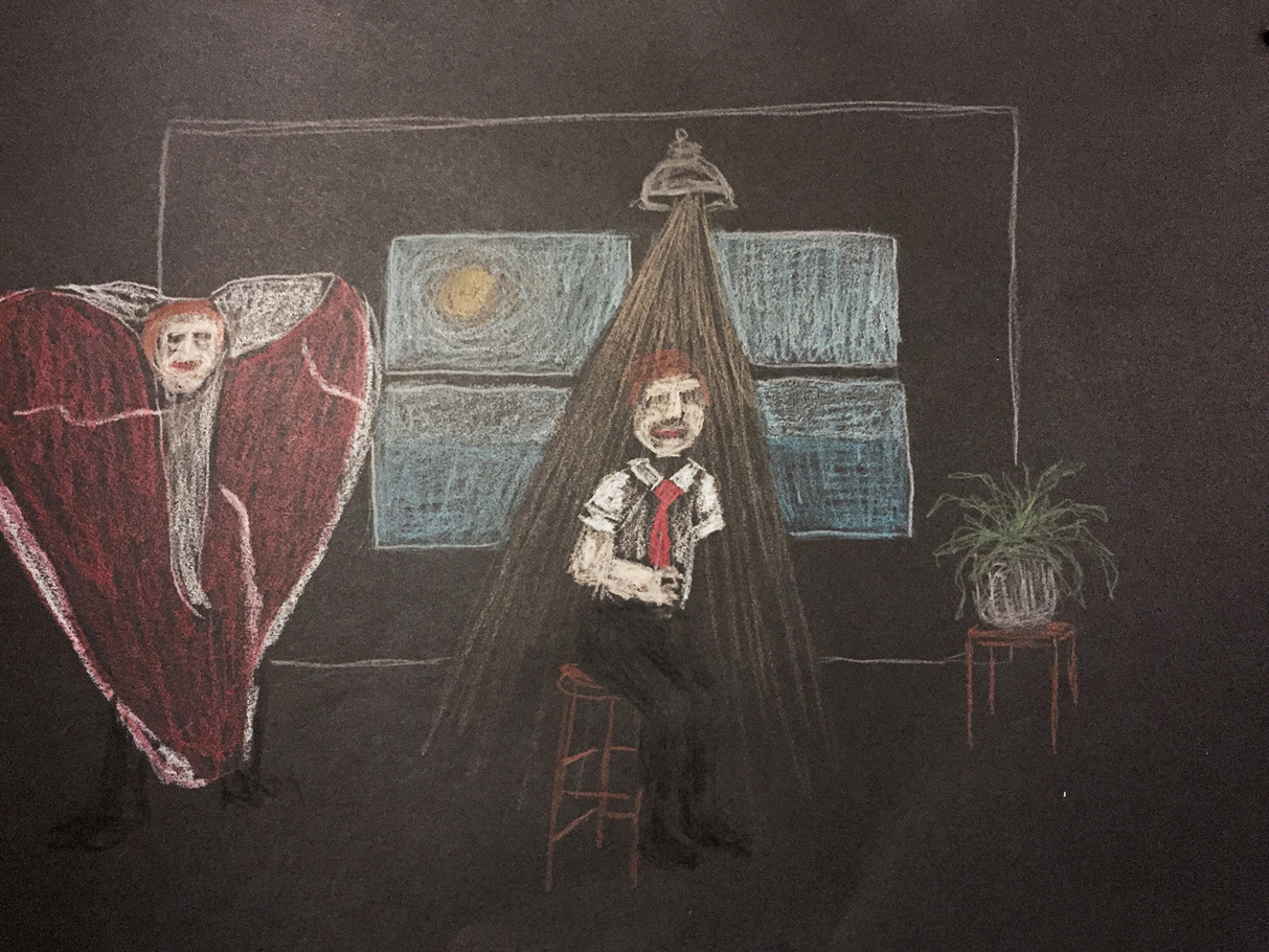 Gretel dislocates Hansel’s wrist and begins to weep, stands back from him staring down at his hand, then steps forward and begins to slam his wrist against the chair, cutting his skin. She pulls the hand free from his arm. Gretel, eyes only on the object, takes a bite.